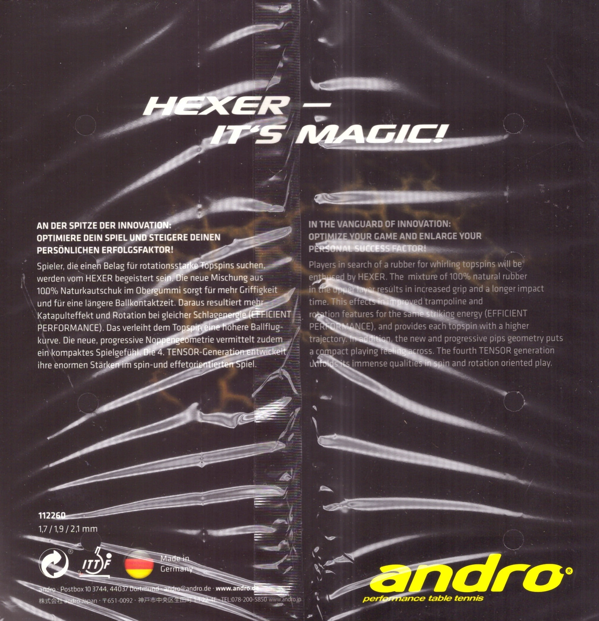 - Borracha 100% natural: A camada superior da Hexer é composta por borracha natural de alta qualidade, o que garante maior aderência à bola e um tempo de contato mais prolongado. Isso resulta em um efeito catapulta mais pronunciado e rotação máxima em cada golpe.