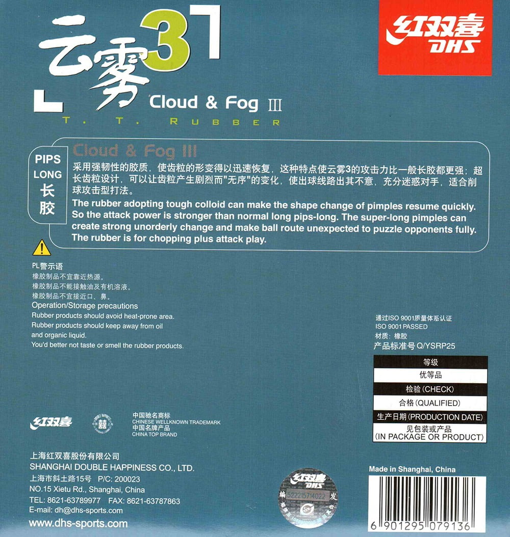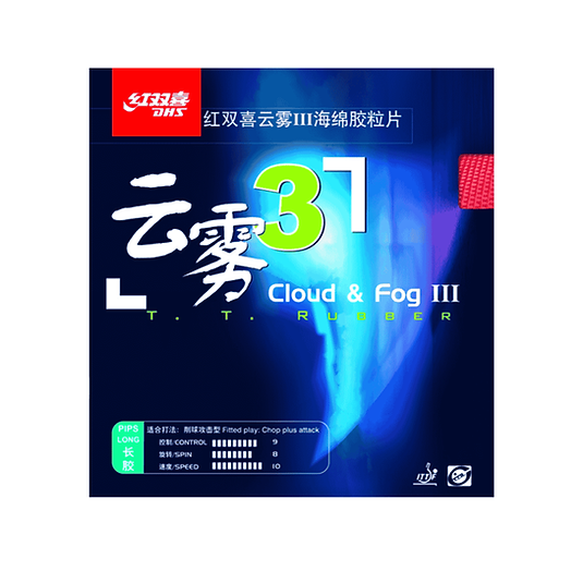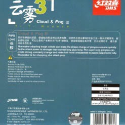 A DHS Cloud & Fog 3 é uma borracha de pinos longos projetada para jogadores que priorizam controle e disrupção. Com uma combinação de velocidade moderada, efeito imprevisível e excelente consistência, é uma escolha confiável para quem busca variar táticas defensivas e ofensivas com pinos longos. 🏓✨