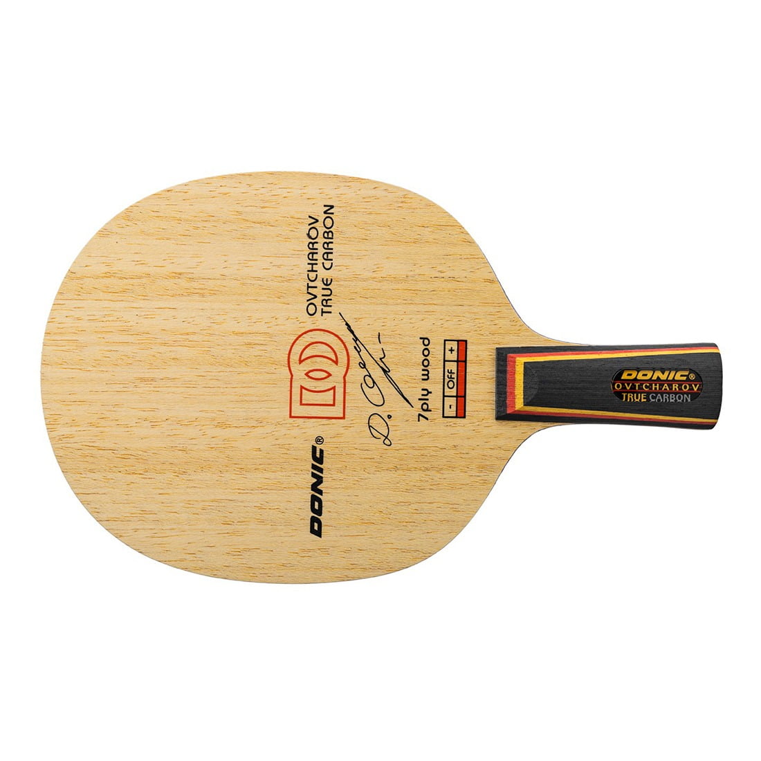 “O Verdadeiro Carbono vem com cinco folheiros de madeira e duas camadas de carbono. A lâmina oferece um equilíbrio perfeito de velocidade e sensação. Depois que Dimitrij ganhou sua segunda medalha de ouro em simples nos campeonatos europeus, Donic projetou o True Carbon para permitir melhorias em seu estilo de jogo.