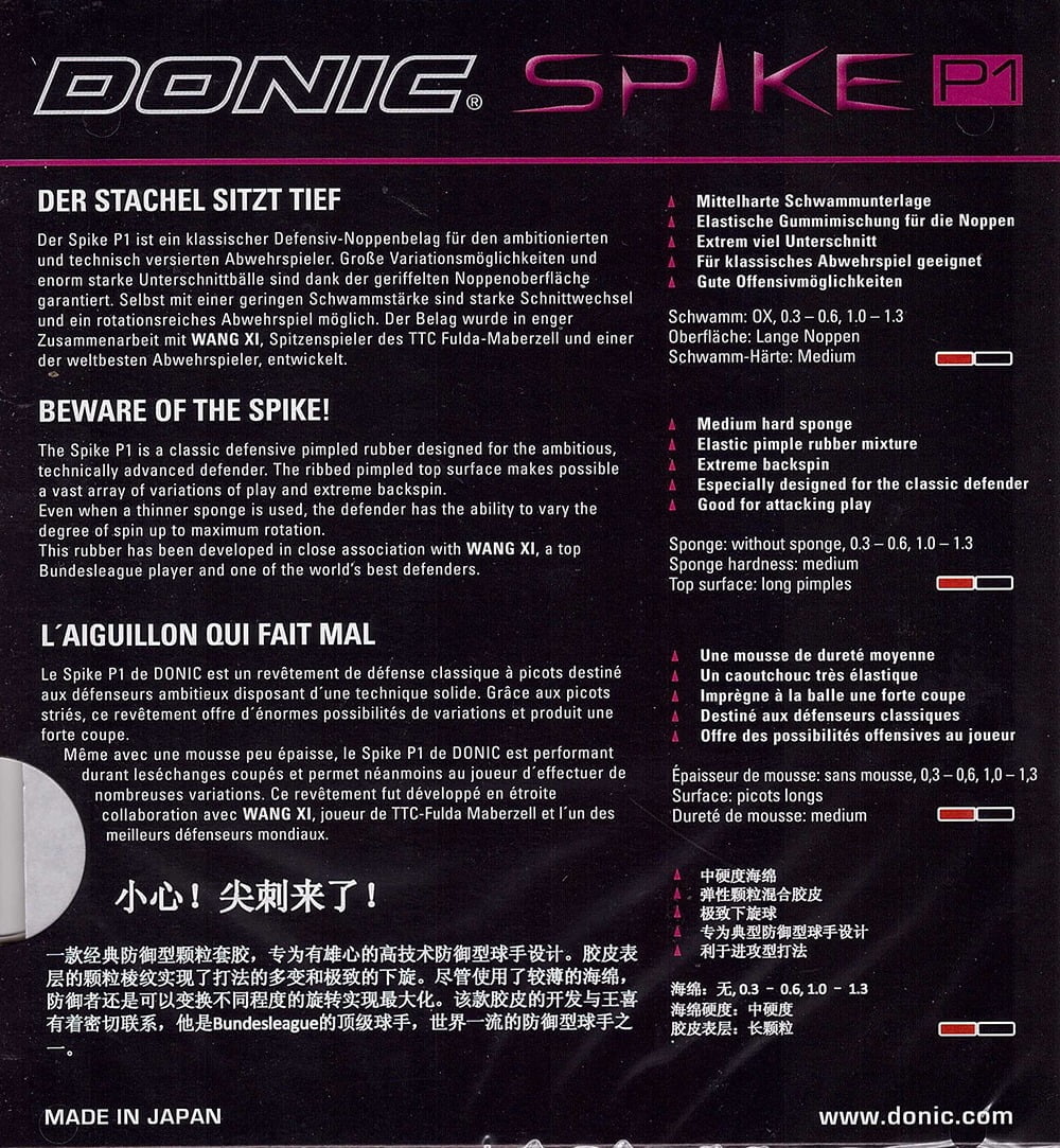 “Spike P1 é uma clássica borracha defensiva projetada para o ambicioso e tecnicamente avançado defensor.