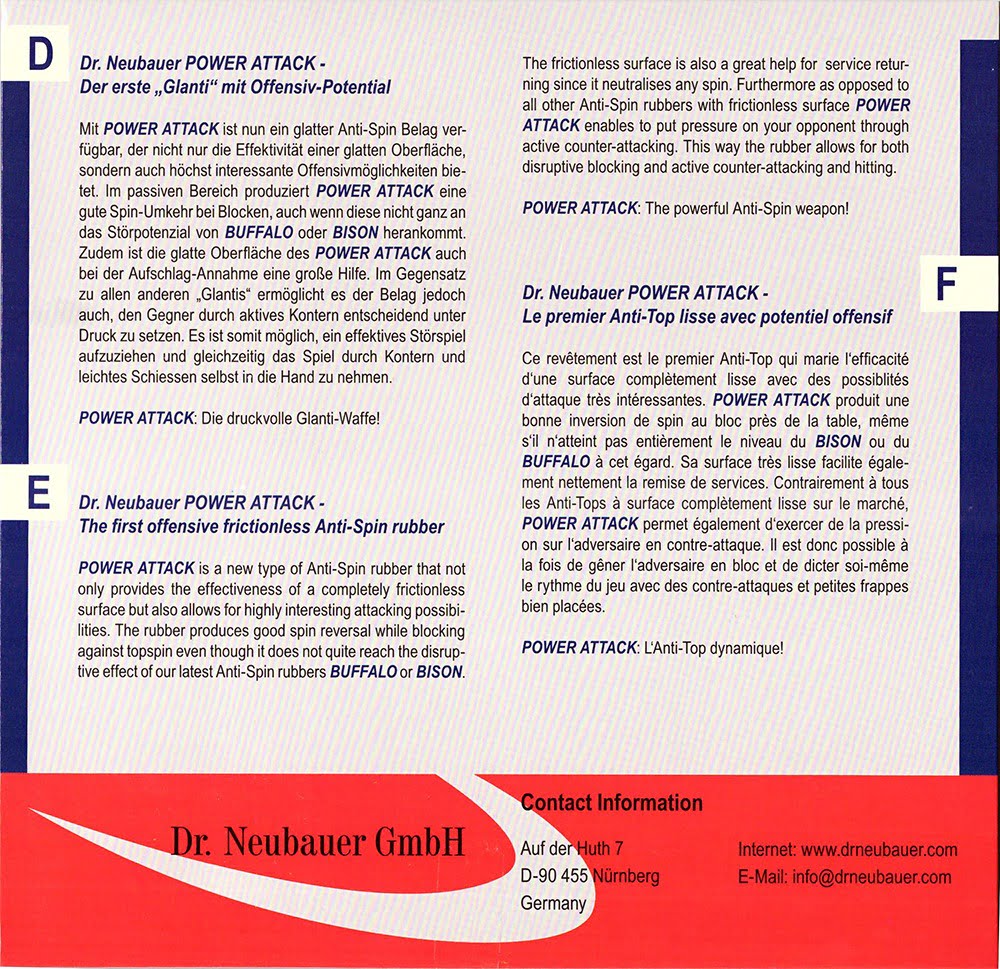 A Dr.Neubauer Power Attack é uma borracha de tênis de mesa do tipo lisa, desenvolvida para jogadores ofensivos que priorizam velocidade elevada, trajetória direta e pressão constante no jogo próximo à mesa. Indicada para estilos agressivos, essa borracha é especialmente eficaz em batidas secas, contra-ataques rápidos e bloqueios ativos, oferecendo resposta imediata e comportamento previsível.