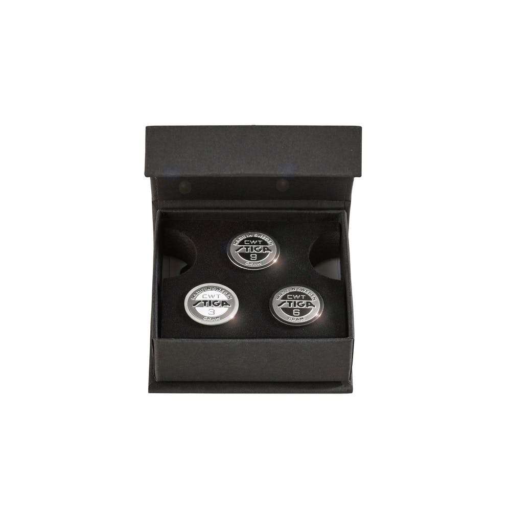 - A Stiga CWT permite ajustar o peso e equilíbrio da lâmina usando pesos de 3, 6 e 9 gramas, anexados facilmente ao fundo do cabo com ímãs internos.