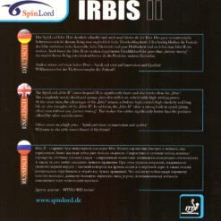 O Irbis II é mais rápido e mais difícil em comparação com o Irbis padrão. Esta borracha é equipada com uma esponja moderna que é afinada para ter excelente controle e potência. O Irbis II herda o controle, a elasticidade e o longo tempo de vida dos Irbis originais.