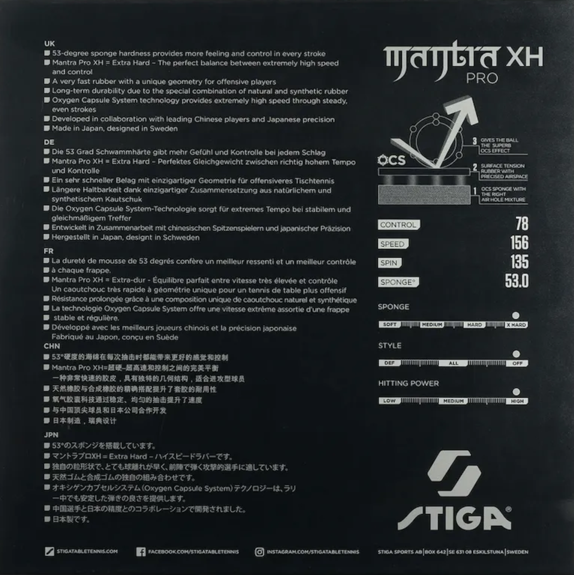 A Stiga Mantra Pro XH é a borracha mais dura e agressiva da linha Mantra, projetada para jogadores ofensivos de elite que buscam potência máxima e controle firme em cada golpe.