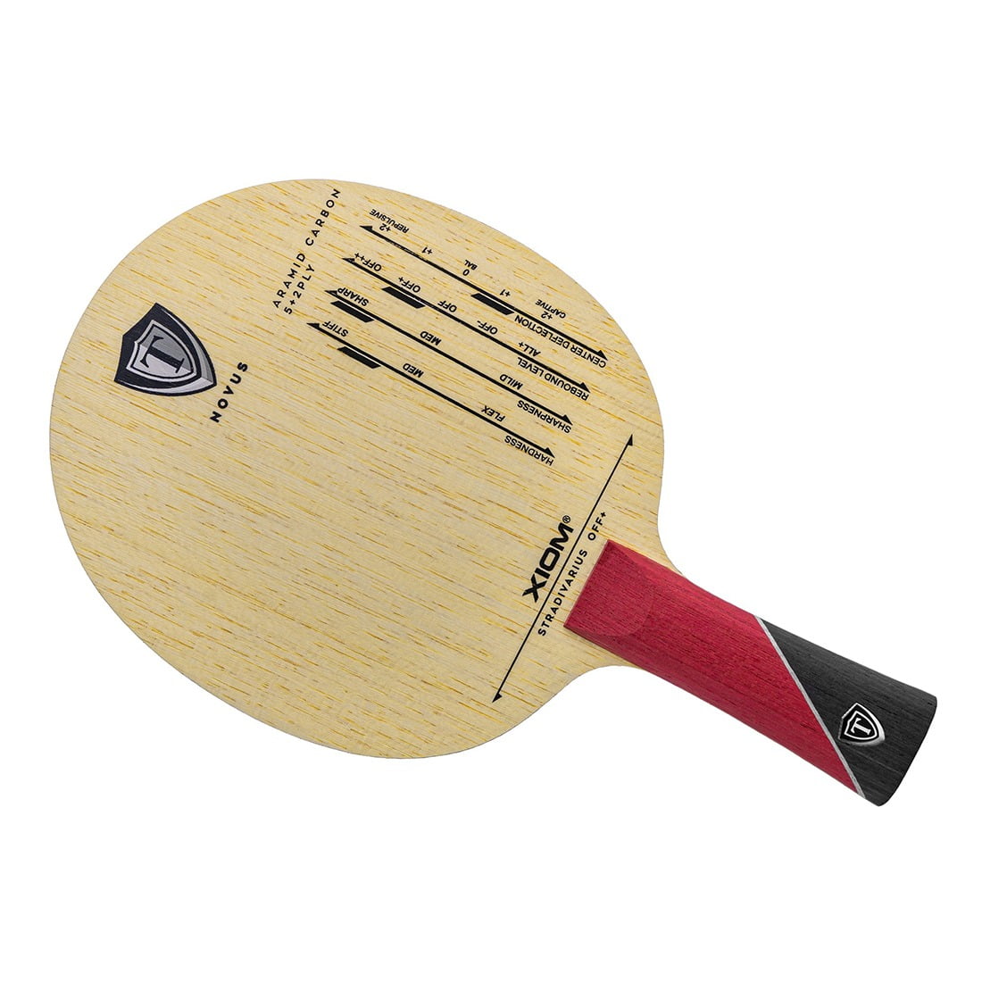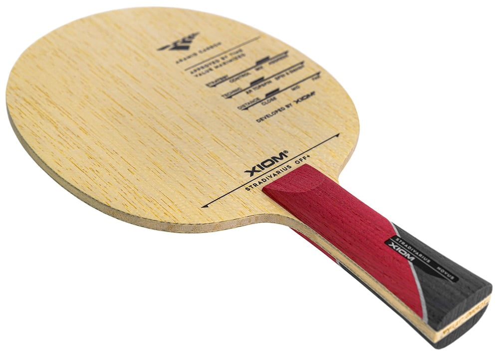 STRADIVARIUS, que tem sido um dos mais vendidos da XIOM, renasceu para os principais jogadores da nova era. Aramid Carbon, que é a mistura de vibração absorvendo Aramid macio e carbono altamente elástico, fornece desempenho ideal para jogadores ofensivos profissionais. STRADIVARIUS pega a bola profundamente com deformação suficiente, mas a vibração residual após o impacto é muito reduzida por material de alta tecnologia. Os resultados são a combinação de capacidade de giro excepcional e sensação estável. O jogador pode sentir o momento do impacto diretamente e claramente sem qualquer vibração irritante. O ataque de topspin perto da mesa ou de distância média é muito poderoso e seguro. Quando combinado com a nova borracha ”Hyper Elasto” como o VEGA PRO, STRADIVARIUS mostra um desempenho ainda maior.